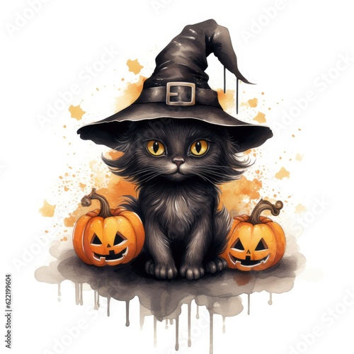 black cat witch character with halloween pumpkins - watercolor illustration created using generative AI tools
