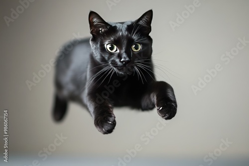 Black Cat with Green Eyes Suspended in Mid-Air