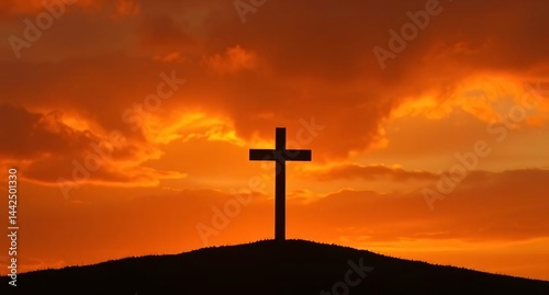 Black Christian cross on top of a hill against a vibrant orange sunset sky with clouds