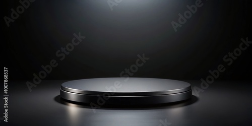 Black circular platform on a dark background , minimalistic, space, empty, modern, design, geometric, precise, shadow, top view