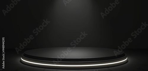 Black Circular Podium with White Light Line for Product Presentation on Grey Background, 3D Rendering