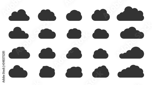 Black cloud set. Different shape weather icon clouds. Design element, web cloudy service symbol. Fun speak bubbles, blank sign glyph balloon template for text. Isolated on white vector illustration