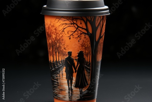Black coffee cup with a painting of a couple in the park on an autumn day. Realistic style, warm colors, ceramic cup with black lid, ideal for fall or winter.