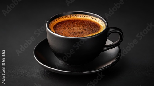 black coffee, espresso, coffee cup, saucer, dark background, coffee bean, caffeine, aroma, beverage, drink, hot drink, coffee break, food photography, texture, contrast, shadow, lighting, ambience, mood, relaxation, comfort, energy, invigorating, stillness, contemplation, closeup, detail, delicious, cafes, eatery, cafes, dining, drinking, presentation