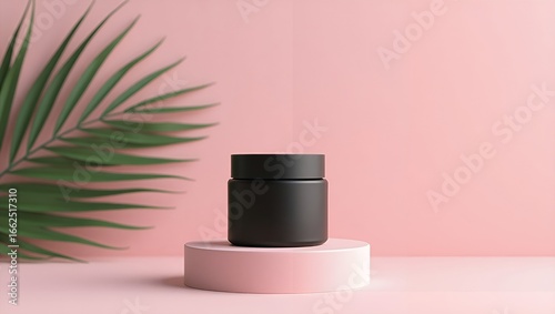 cosmetic, jar, black, pink, pedestal, skincare, beauty, product, cardboard box, minimal, luxury, design, wellness, elegant, container, cream, lotion, branding, template, display, studio, modern, tropical, palm, leaf, organic, natural, stylish, minimalist, background, clean, object, presentation, commercial, advertising, smooth, fresh, marketing, fashion, lifestyle, glossy, round, plastic, feminine, spa, health