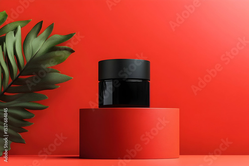 Black cosmetic jar on a red pedestal with tropical foliage.