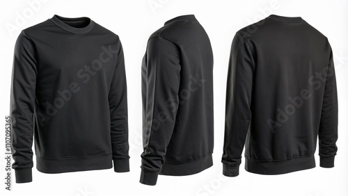 Black crewneck sweatshirt in front, side, and back views. Ideal for e-commerce listings, fashion catalogs, and promotional materials for sportswear brands