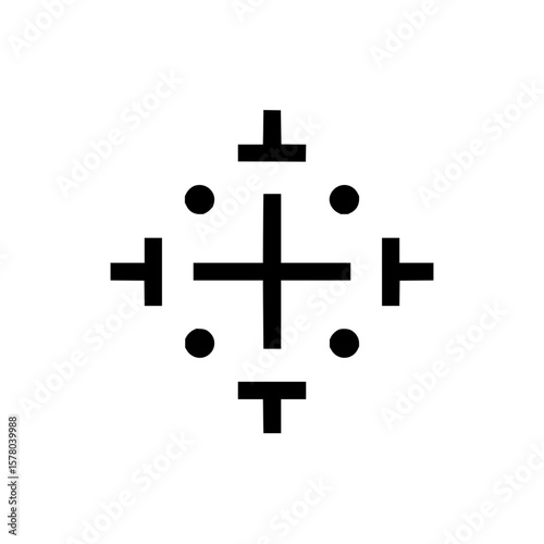 Black cross centered with four t shapes and four circles arranged symmetrically on a white background
