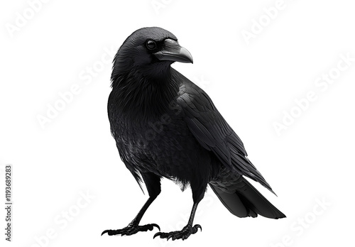 Black crow isolated on a white background studio shot photorealistic high-resolution photography detailed skin texture high-quality details natural lighting full-body portrait stock photo