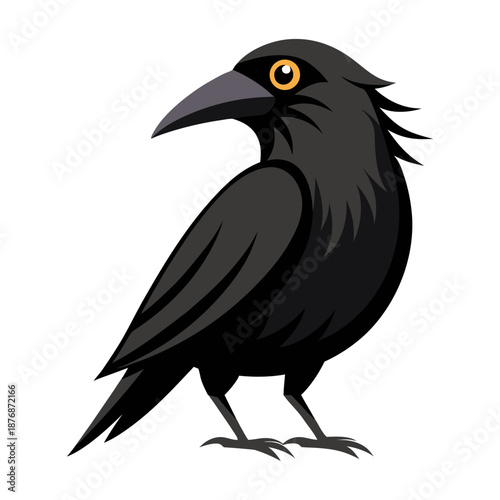 Black crow perched on a branch in a simple vector style on a white background