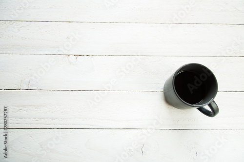 Black cup with coffee on the white table. White wooden background. Board of boards