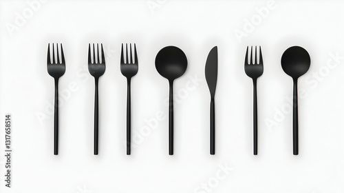 Black cutlery set on white background; forks, spoons, knife; flatlay for restaurant menu or food blog