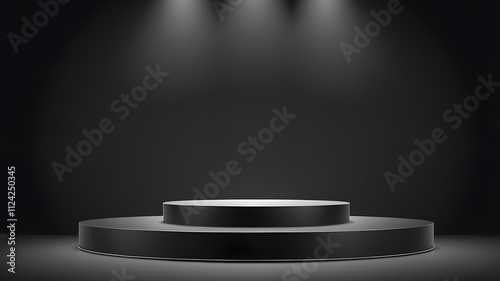 Black cylindrical platform sits on black background. 3D podium