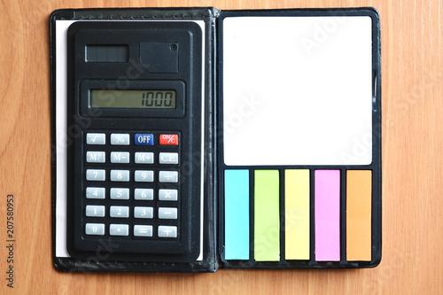 Black digital office calculator with solar panel and notebook with color sticker and empty white paper blank for note on wooden table. Top view