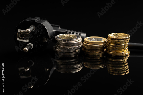 Black electric plug and euro coins on black background. Concept of increasing electricity prices.