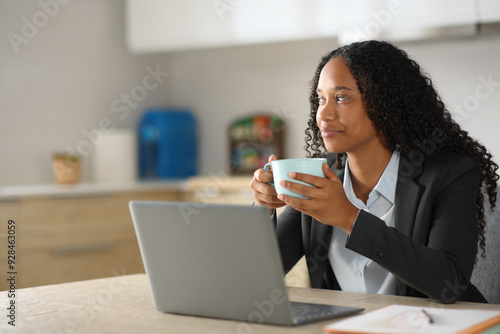 hot drink, executive, breakfast, mind, relax, distracted, happy, drink, peace, work, working, tea, tele, telework, online, break, rest, home, kitchen, satisfied, mindful, laptop, computer, black, woman, calm, business, person, entrepreneur, self, employed, freelance, girl, well, being, mug, cup, day, men at work, employee, businesswoman, stress, relief, house, apartment, african, american, ethnic, diverse