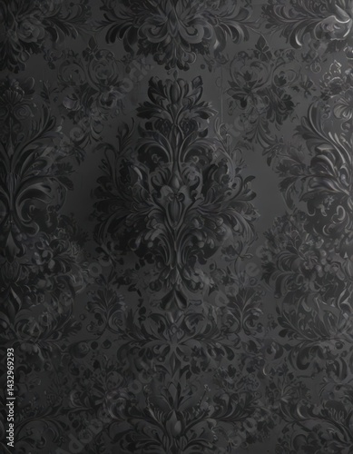Black floral damask on muted grey; dark, opulent design , dark grey, elegant