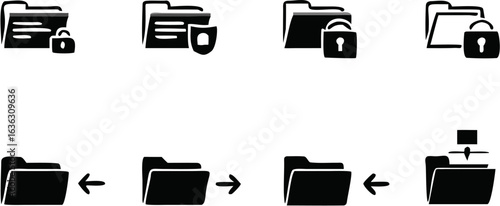 Black folder icons showing security features and file transfer options in a vector graphic set of eight | editable eps vectors silhouette