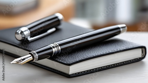 pen, notebook, stationery, writing, black, elegant, office, professional, leather, fountain, reflections, workspace, business, education, closeup, design, luxury, tool, editorial, thought