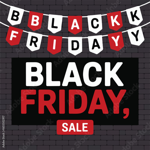 Black Friday Sale Banner with Hanging Alphabet Flags and Brick Wall Background