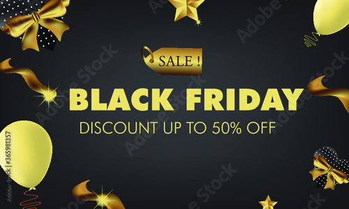 Black friday sale inscription gold letters on a black background, horizontal banner, design template. Copy space, creative background. 3D illustration, 3D design.