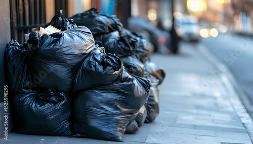 Black garbage bags piled on the sidewalk in an urban environment, contributing to pollution