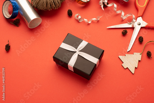 Black gift box in a Christmas gift warping composition. Bright red background.