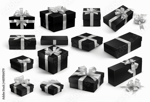 black gift box set with silver ribbon from side, front and top view. open and closed. isolated on white background.
