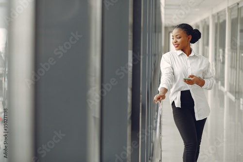 Black girl in the office. Woman in a white shirt. Lady use the phone.
