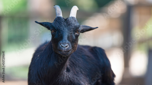 ranch, horned, horn, closeup, outdoors, animal, nature, farm, mammal, domestic, cute, grass, agriculture, portrait, goat, black, farming, head, summer, rural, meadow, field, funny, farm animal, fur, brown, wildlife, pet, young, goat, green, white, landscape, village