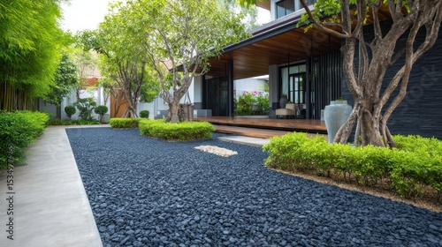 Black gravel landscaping near modern house
