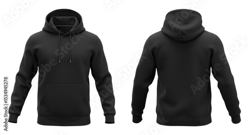 hoodie, black, sweatshirt, pullover, apparel, clothing, blank, template, front, back, view, casual attire, fashion, design, wear, activewear, cotton, fabric, hooded, top, jacket, jersey, long sleeve, tracksuit, isolated, render, three-dimensional, illustration, presentation, product, style, man, woman, unisex, urban, garment, clothes, photorealistic, mock-up