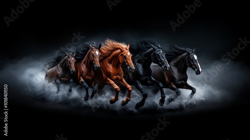 Black Horses in Motion: A dramatic and powerful image of five black horses, their manes flowing in the wind, galloping through a misty landscape.