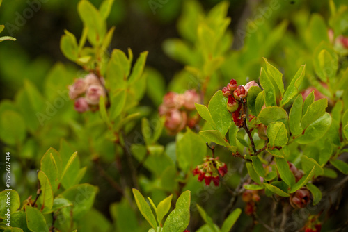 Black Huckleberry Bloom Wiht Pink and Red Flowers Against Bright Green Leaves