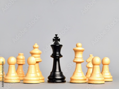 chess, king, strategy, leadership, competition, game, black, white, piece, pawn, rook, bishop, knight, queen, board, challenge, power, business, success, concept, isolated, grey background, wooden, figure, planning, tactic, management, confrontation, rivalry, intelligence, skill, achievement, victory, tournament, play