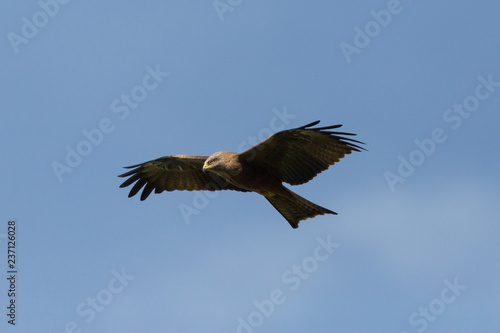black kite (milvus migrans) flying, blue sky, open wings