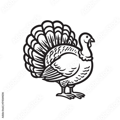 thanksgiving, day, turkey, bird, fowl, animal, poultry, feast, dinner, holiday, line, drawing, vignetting, graphic, outline, black, white, isolated, gobbler, tail, mascot, symbol, character, plume, farm, nature, traditional, minimal, simple, seasonal