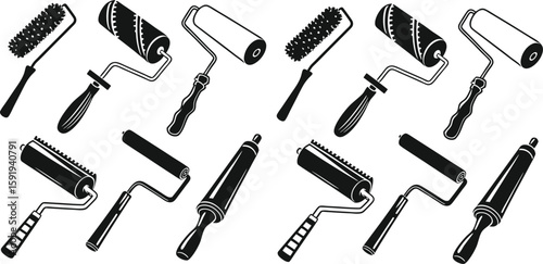 Black Line Paint Roller Icons Set including Flat Painting Tool Renovation and Decoration Symbol Collection with Minimal Roller Icon Group for UI Web Construction Wall and DIY Projects
