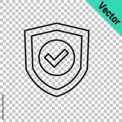Black line Shield with check mark icon isolated on transparent background. Protection symbol. Security check Icon. Tick mark approved icon. Vector