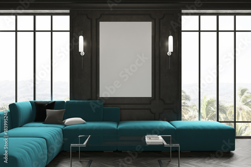 Black living room, blue sofa and poster