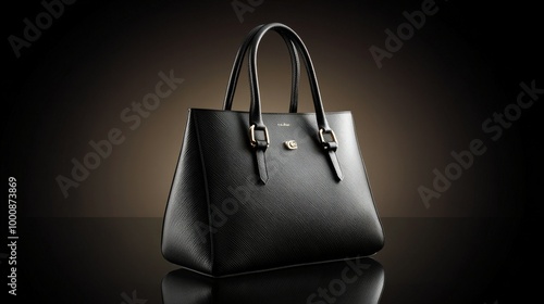 Black luxury leather handbag. High class fashion item, emphasizing clean design and sophistication. Leather texture details.