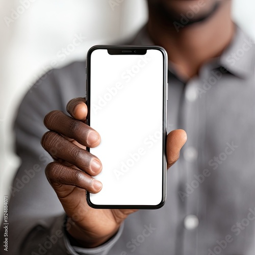 person, black, man, hand, holding, smartphone, phone, display, screen, blank, white, empty, vertical, portrait, closeup, sharpened, detail, gesture, presenting, showing, communication, tech, technology, device, contraption, interface, modern, touch screen, smart, digital, app, mobile, application, information, connection, cyberspace, network, online, lifestyle, business, office, indoor, light, blurred, grey, shirt, collar, sleeve