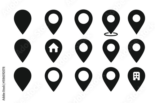 Black map pins vector icons set. Location markers, navigation symbols, and GPS destination pointers. Address place finders for web, app design. Home, business indicators.