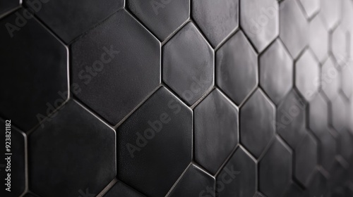 Black matte hexagon tiles creating a geometric pattern, perfect for a contemporary bathroom or kitchen.
