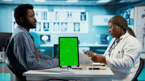 Black medic meets with patient next to isolated mockup display at the office, doing routine consultation and reviewing records for a treatment plan. Physician at private clinic. Camera B.