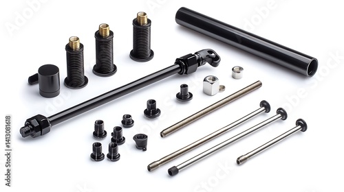 hardware, kit, component, screw, bolt, nut, washer, rod, tube, black, industrial, engineering, mechanical, manufacturing, technology, assembly, detail, precision, workshop, factory, equipment, machinery, tool, spare part, accessory, isolated, white background, closeup, macro, object, construction, design, fitting, repair, maintenance, supply, element, high-quality, healthy lifestyle, trendy