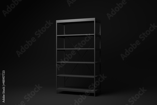 Black metal rack storage. Retail shelf rack on black background. minimal concept idea. monochrome. 3d render.