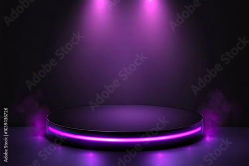 Black neon podium for Halloween with purple glowing light on dark background. Cylinder flat 3d platform. Vector illustration with generative ai