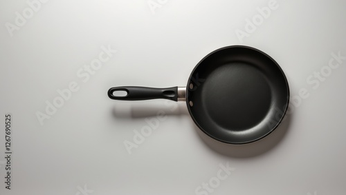 Black nonstick frying pan isolated on a light surface suitable for culinary and kitchenware visuals with a clean design aesthetic.