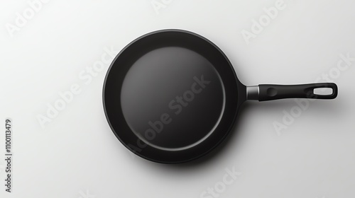 Black nonstick frying pan with a sleek handle, topdown view, centered isolated on white background